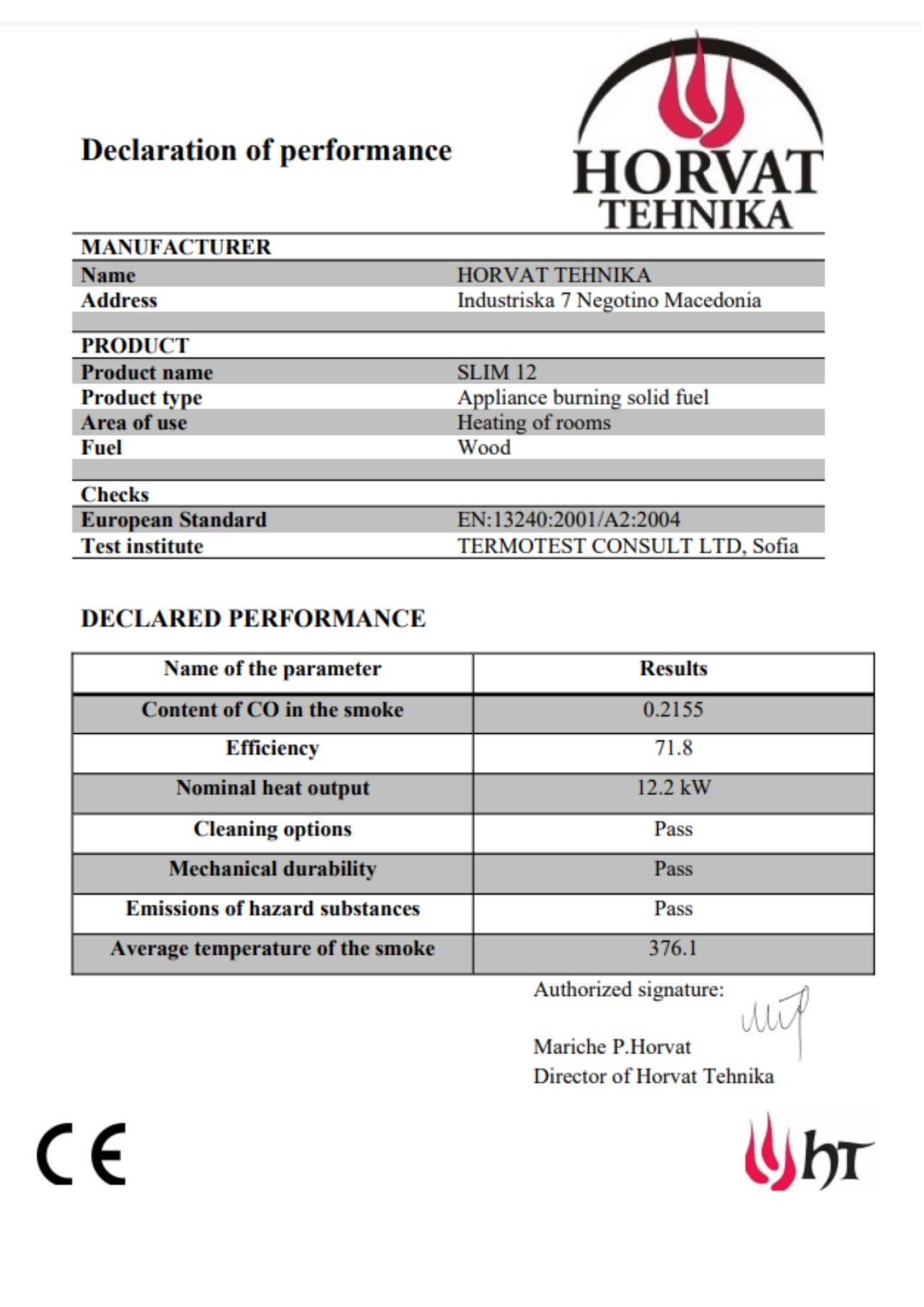 U skladu sa svim pećima koje nudimo, Slim 12 ima oznaku CE prema EN13240.